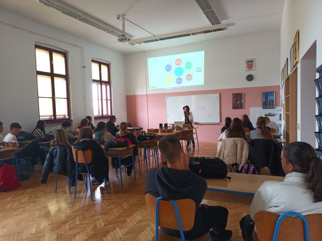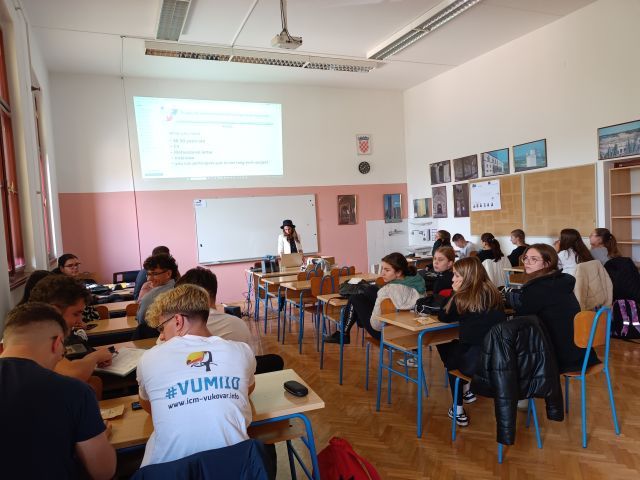 Strani dugoročni volonteri PRONI Centra, Alexandra i Lucas, predstavili su ukratko program Europske snage solidarnosti (u okviru kojeg volontiraju u Vukovaru), kao i mogućnosti za volontiranje koje se mogu pronaći na Europskom portalu za mlade. Ovakvi primjeri mobilnosti potaknuli su učenike da pitaju naše dugoročne volontere o motivaciji i ujedno razmjene volonterstva iskustva.