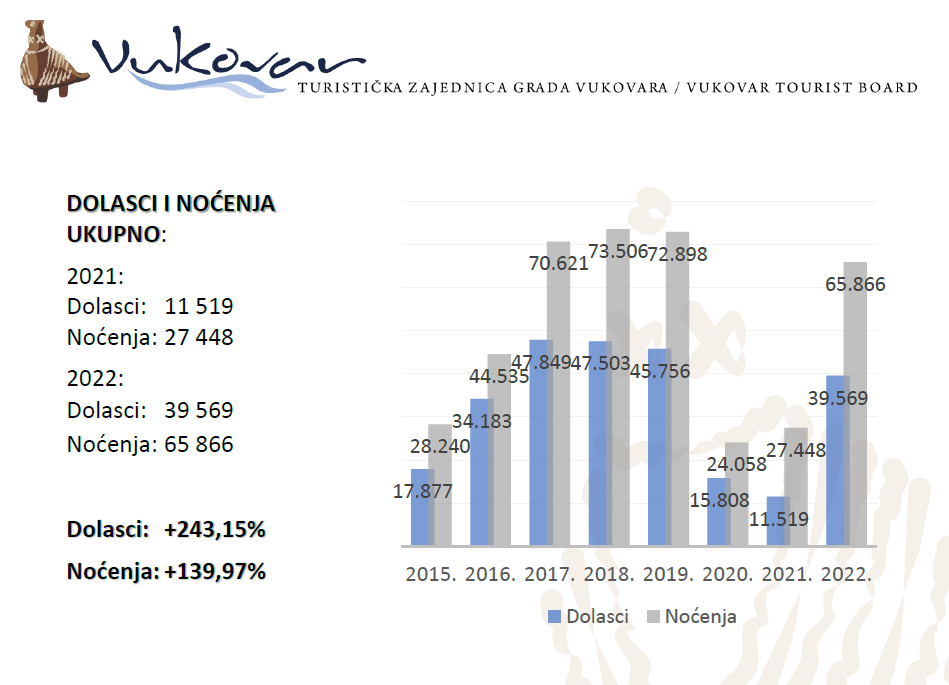 Naime, Vukovar je i u 2023. godinu ušao s odličnim turističkim rezultatima. U odnosu na 2020. i 2021. godinu koje su bile obilježene pandemijom koronavirusa, u 2022. godini turizam i turističke aktivnosti su se vratile u potpunosti.
