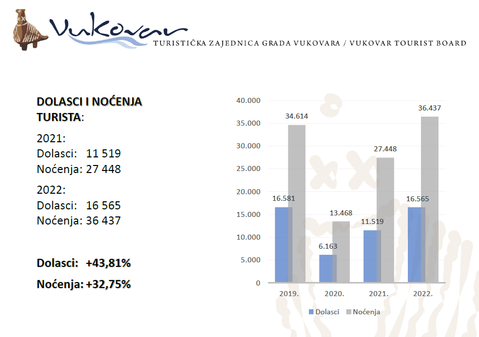 U odnosu na 2021. godinu, u 2022. godini bilježi se 43,81% dolazaka turista više te 32,75% više noćenja. Ako se tome pridodaju i školske ekskurzije koje od travnja 2022. nakon pandemije ponovno dolaze u Vukovar, dolasci su povećani za 243,15%, a noćenja za 139,97%.