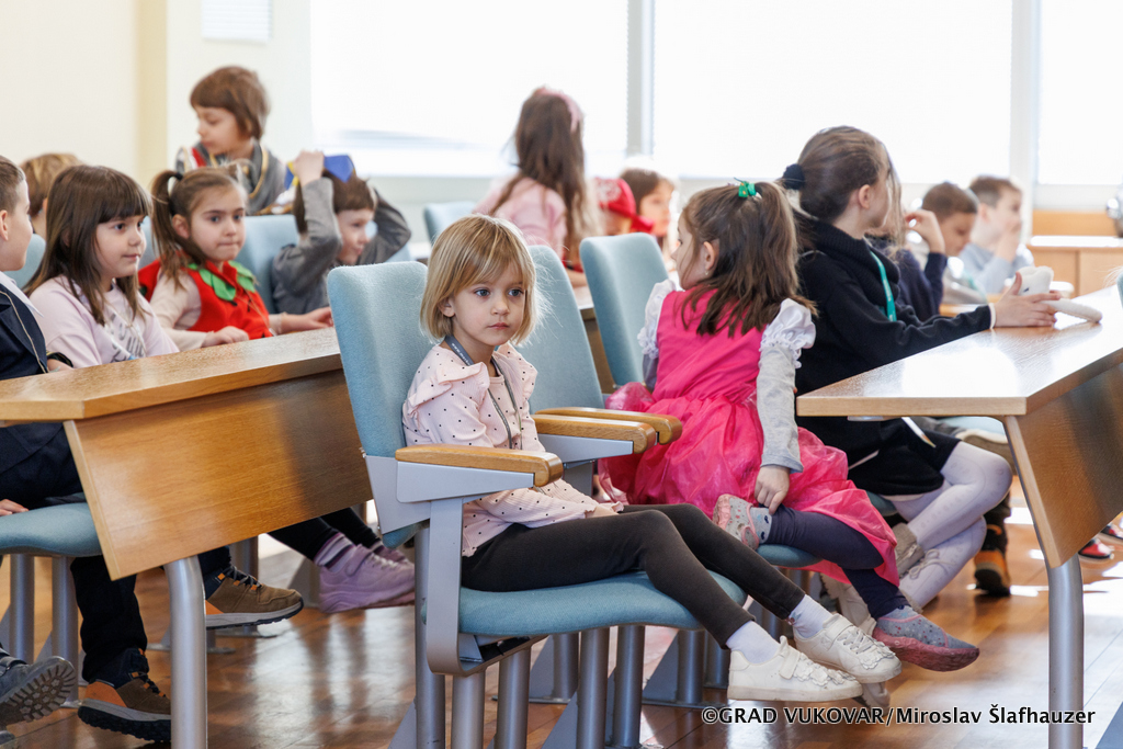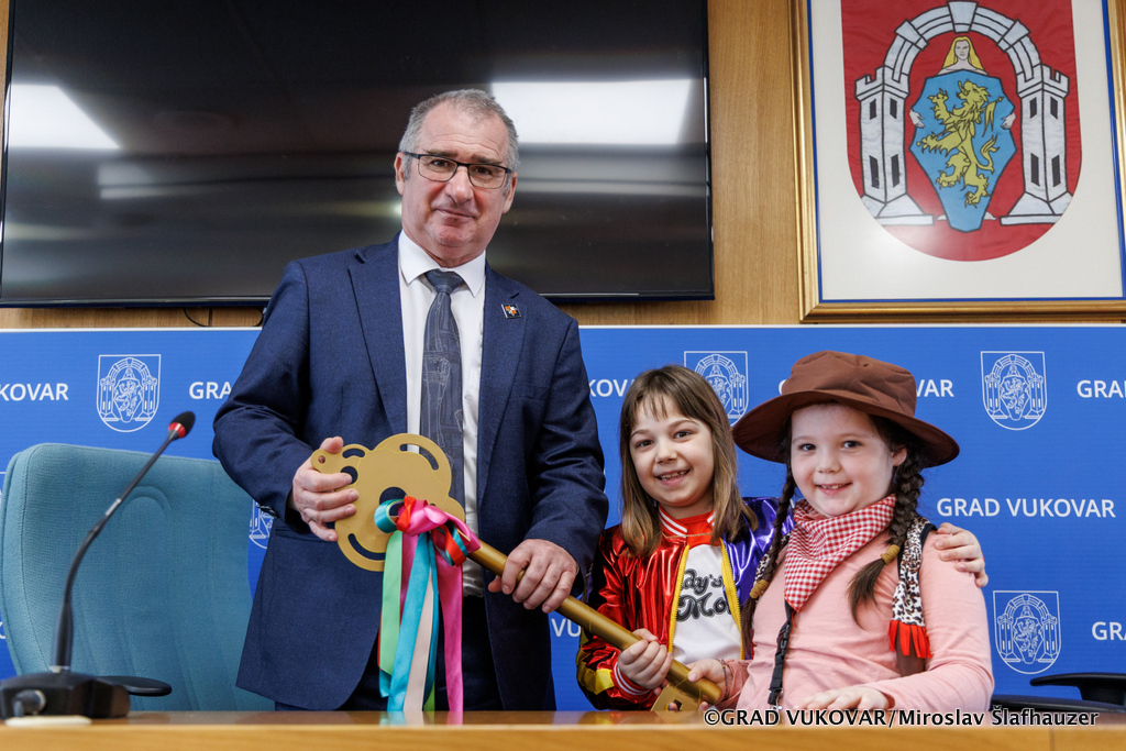 Pročelnik Upravnog odjela za obrazovanje, sport i branitelje Darko Dimić s predstavnicama Turističke zajednice grada Vukovara Davorkom Krajnović Naletilić i Nikolinom Blašković primili su u Gradskoj vijećnici Grada Vukovara maškare kojima su u subotu predani ključevi grada, skupinu Vjeverice Centralnog objekta Dječjeg vrtića Vukovar I.