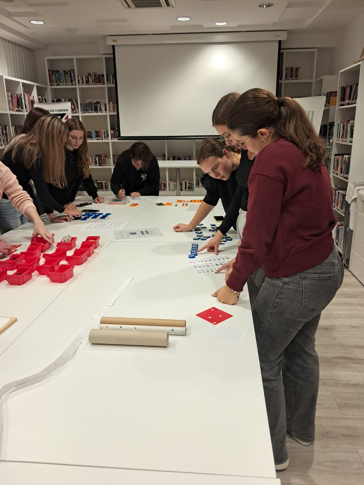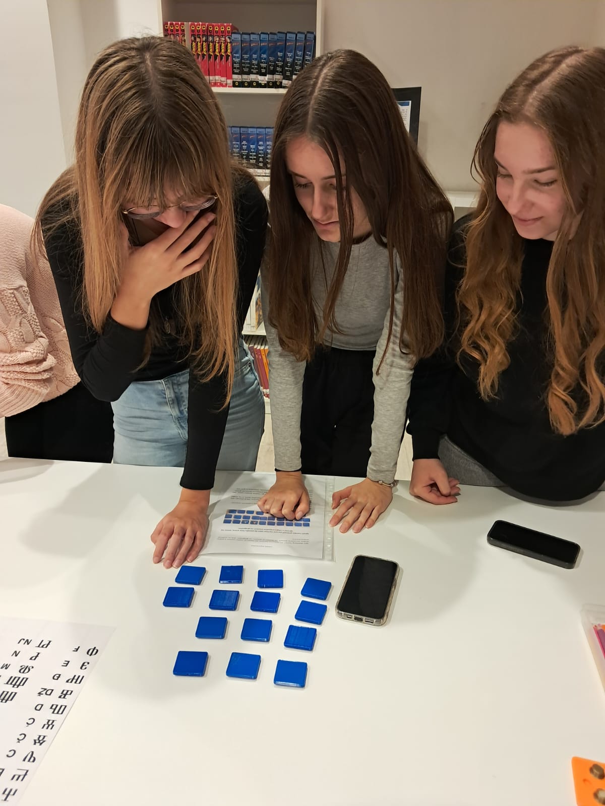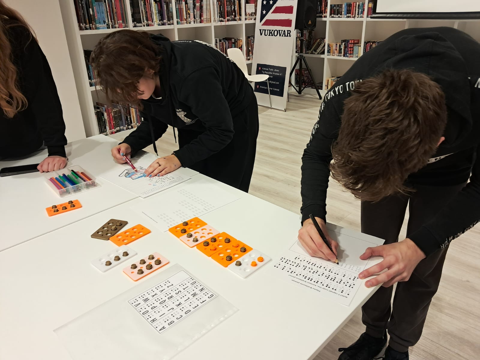 U sklopu prve aktivnosti, polaznici su uz pomoć 3D pločica upoznali Braillovo pismo, sustav pisanja i čitanja namijenjen slijepim ili slabovidnim osobama, koji je 1829. godine osmislio Louis Braille. Za provedbu aktivnosti, ispisane su 3D pločice koje sadrže ukupno šest udubljenja, raspoređenih u tri retka, pri čemu se u svakom retku nalaze po dva udubljenja. Ovaj raspored oponaša standardni format Braillovog pisma. Polaznici su imali zadatak prepoznati određeno slovo na glagoljici i potom smjestiti 3D oblike, slične čepiću, u odgovarajuća udubljenja kako bi kreirali isto slovo na Braillovom pismu. Ova inovativna metoda omogućila je sudionicima praktično razumijevanje načina na koji Braillovo pismo funkcionira, osnažujući njihovu percepciju o važnosti dodira u čitanju i pisanju.