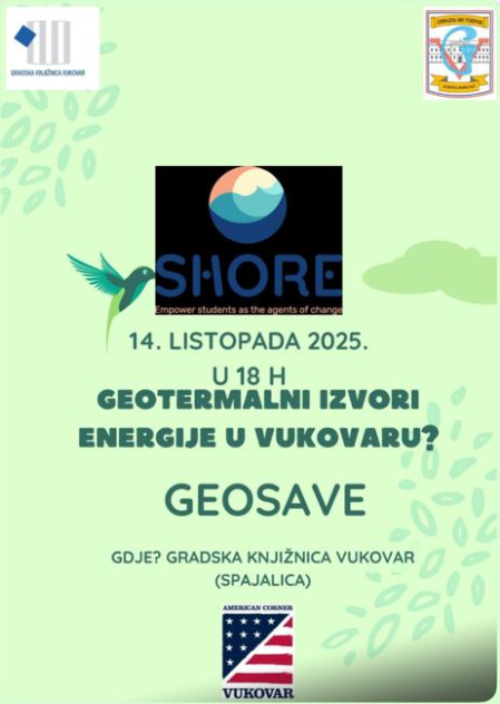 U Gradskoj knjižnici Vukovar, Odjelu za mlade „Spajalica“, 14. listopada 2025. održana je radionica Geotermalni izvori energije u Vukovaru. Radionicu su osmislili i organizirali učenici i nastavnici Gimnazije Vukovar. Radionica je dio školskog projekta GEOSAVE, koji se u Gimnaziji Vukovar provodi u sklopu europskog projekta SHORE – Empower students as the agents of change.