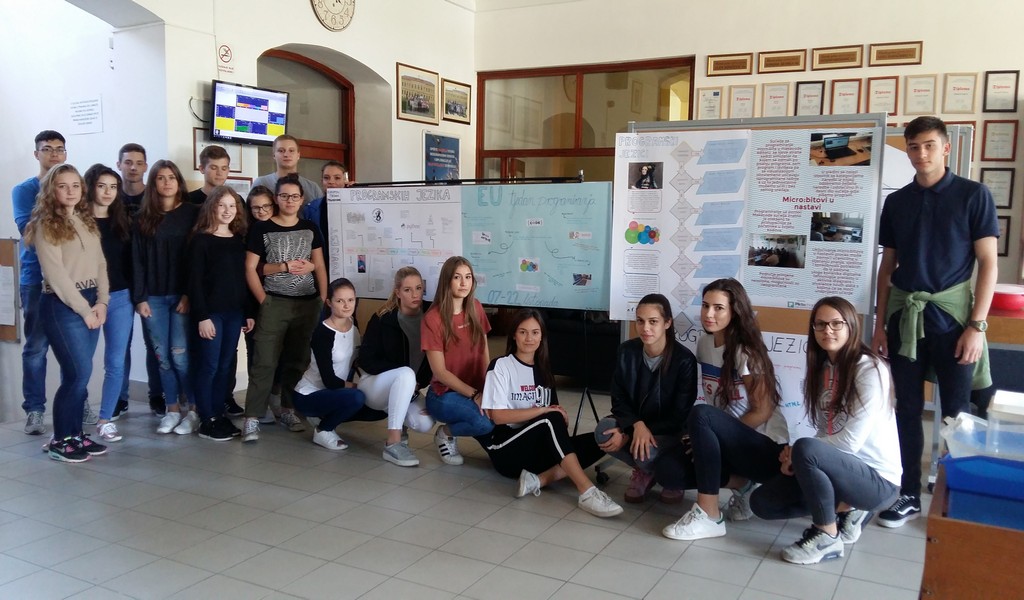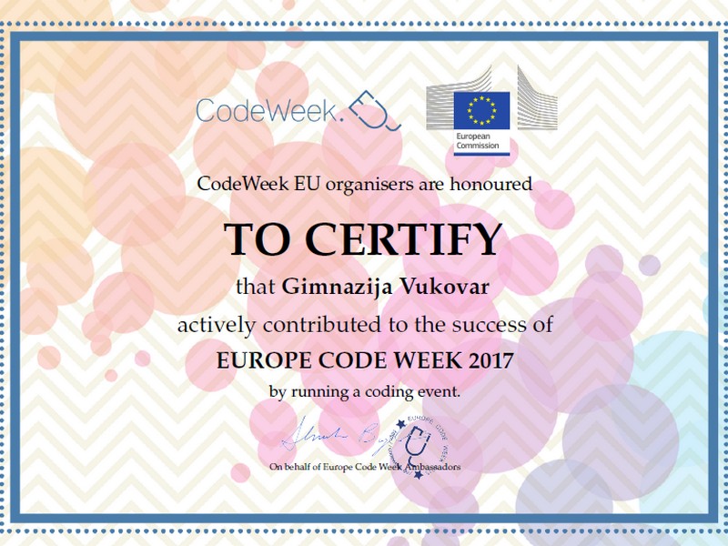 Prošle školske godine po prvi puta smo se i mi uključili u događanje pod nazivom Europski tjedan programiranja (#CodeEU) kojega provode volonteri koji promiču programiranje u svojim zemljama kao ambasadori tjedna programiranja i organizirali niz događanja u okviru izazova CodeWeek4All. Tijekom Tjedna programiranja u svim provedenim aktivnostima sudjelovalo je oko 200 učenika što je više od 50% stope sudjelovanja, te je naša škola uspješno savladala zadani izazov i zasluženo dobila Potvrdu o izvrsnosti u programerskoj pismenosti.