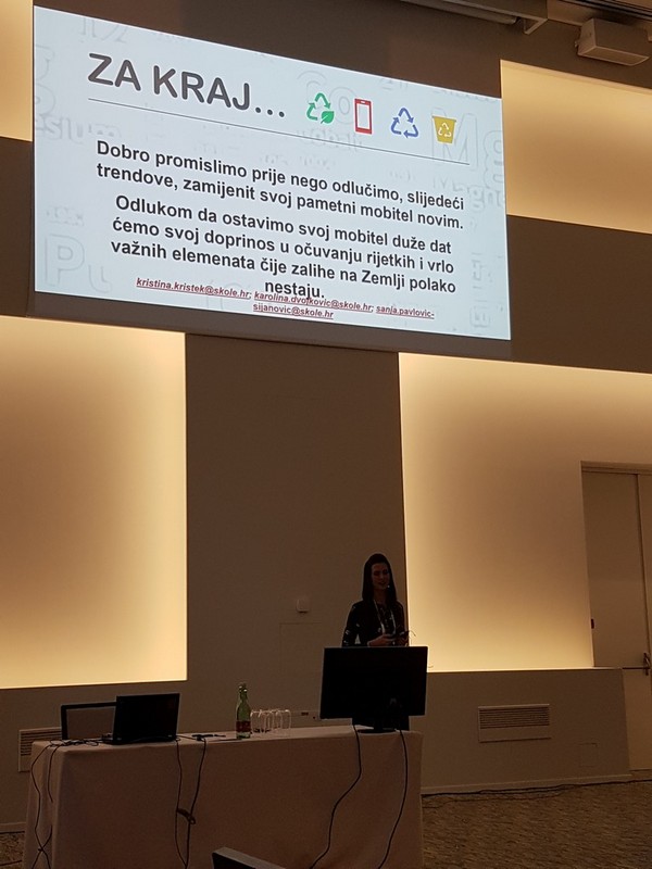 Interaktivnim izlaganjem: Periodni sustav pametnih telefona pokazalo se da današnje generacije odrastaju uz pametne mobitele koristeći ih većinom u svrhu komunikacije i zabave, mijenjajući ispravne uređaje često samo zbog praćenja trendova. Za proizvodnju pametnog telefona potrebno je 70-ak kemijskih elemenata od 118 do sada otkrivenih elemenata. Mnogi elementi spadaju u tzv. ugrožene elemente jer su njihove zalihe neobnovljive i zabrinjavajuće male na Zemlji. Ovim radom povezani su sadržaji i znanja iz 3 predmeta - kemije, fizike i informatike i pokazano je kako nastava može biti zanimljiva i primjenjiva kada uključimo tehnologiju u proces učenja. Učenici su obradili elemente koji se koriste za izradu pametnih telefona i na taj način proširili svoja znanja iz kemije. Upoznali su dijelove i građu pametnih telefona - zaslona, baterije, elektronike, sučelja... što je vezano uz predmete fiziku i informatiku te su koristili alate pomoću kojih su surađivali i kreirali tijekom svog rada. Alat Teams iz Microsoft Office platforme korišten je za komunikaciju i razmjenu informacija i sadržaja između nastavnika i učenika te učenika međusobno. U alatu Piktochart učenici su izradili digitalni plakat kojim su predstavili ovu temu i svoje istraživanje. Plakat je printan i predstavljen učenicima i nastavnicima naše škole. Osim toga organizirana je i akcija prikupljanja EE otpada na razini škole kao i izložba starih mobitela čime smo htjeli potaknuti učenike na recikliranje i zbrinjavanje elektroničkog otpada.