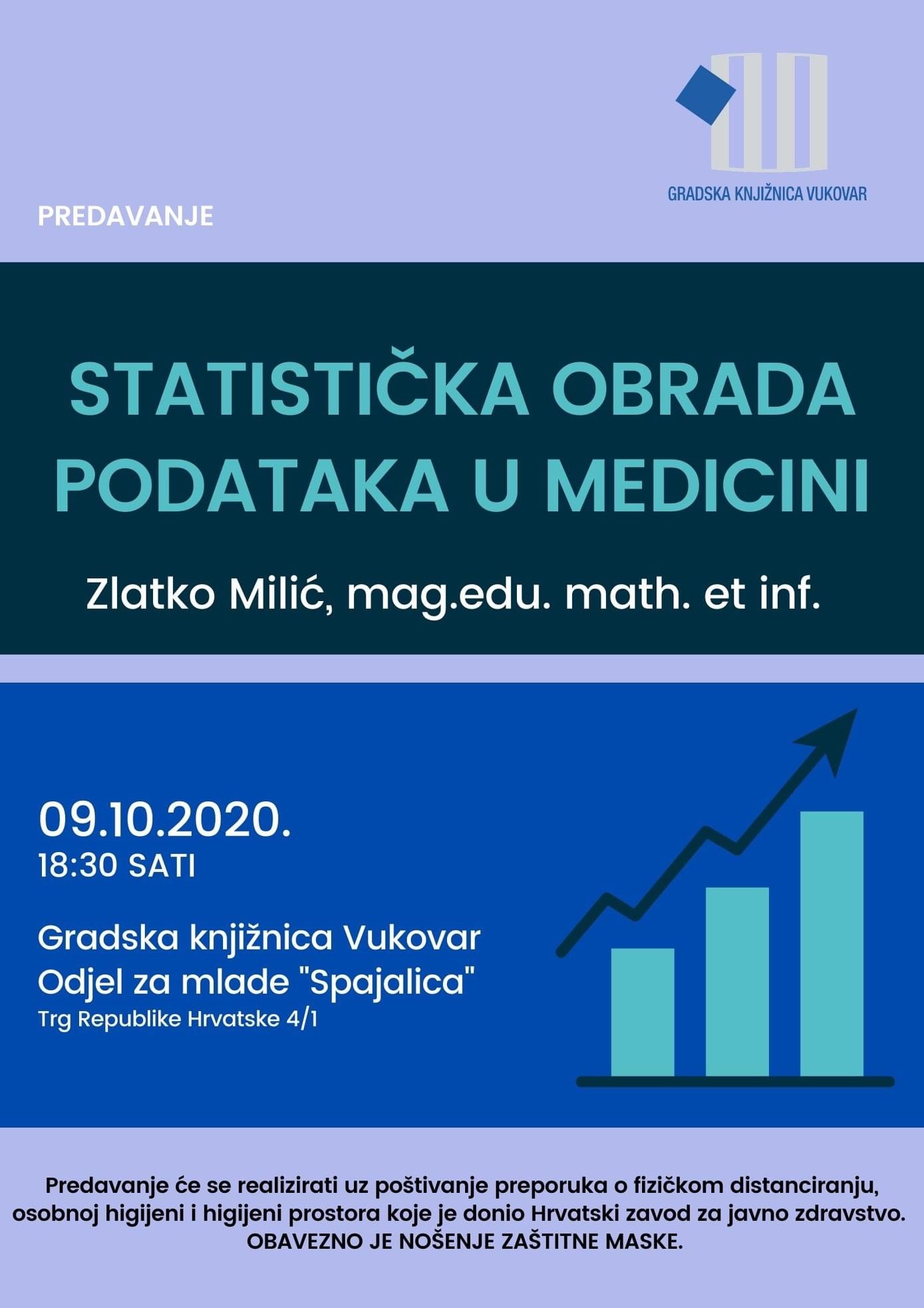 U Gradskoj knjižnici Vukovar u petak, 9. listopada 2020. godine s početkom u 18:30 sati održat će se predavanje pod nazivom „Statistička obrada podataka u medicini”. Predavanje će održati Zlatko Milić, mag.edu. math. et inf.