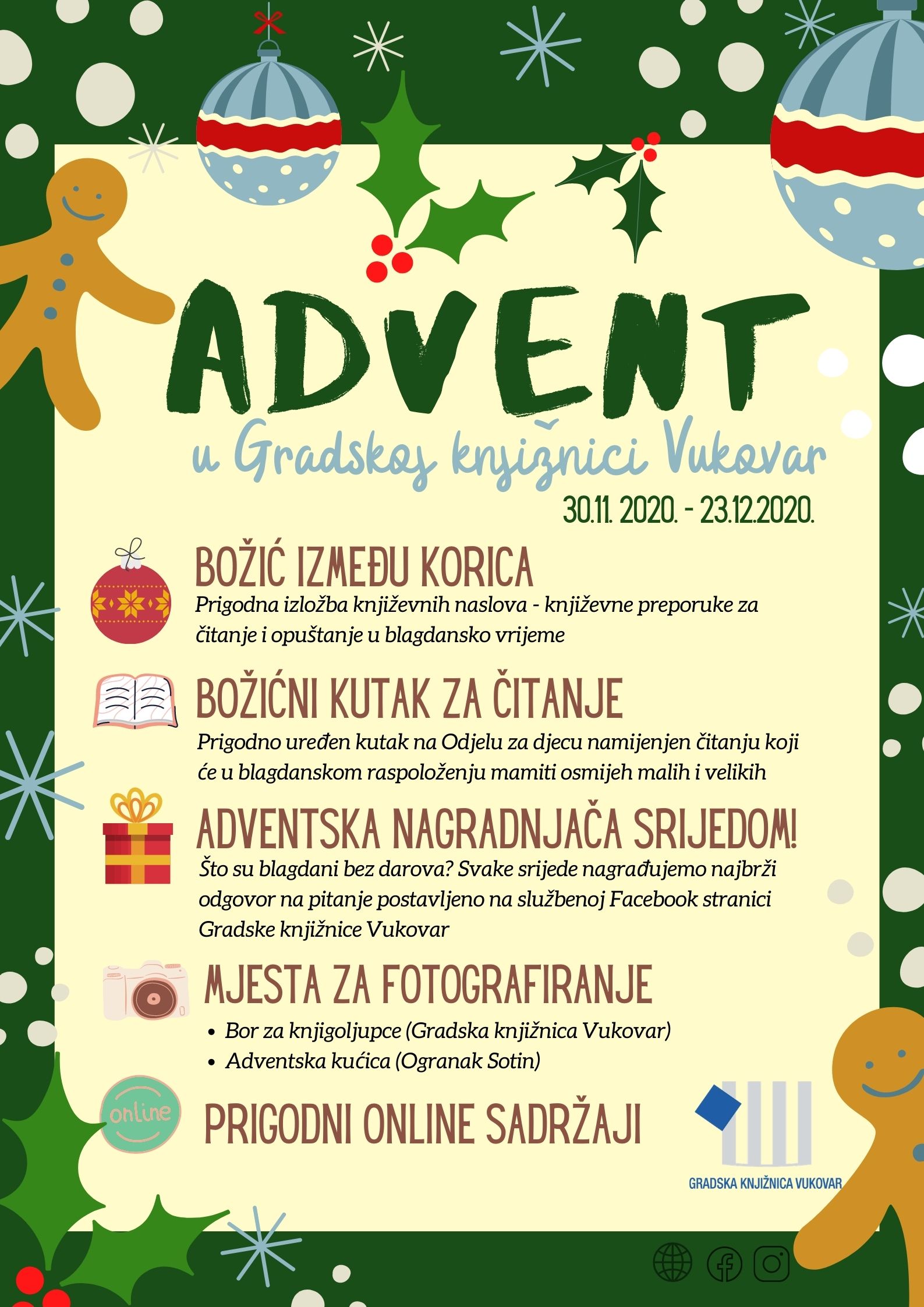 U ponedjeljak 30. studenoga 2020. godine započinje Advent u Gradskoj knjižnici Vukovar. Tijekom Adventa pogledajte izložbu književnih preporuka za čitanje i opuštanje u blagdansko vrijeme pod nazivom “Božić između korica”, posjetite božićni kutak na Odjelu za djecu namijenjen čitanju koji će u blagdanskom raspoloženju mamiti osmijeh malih i velikih ili napravite fotografiju na prigodno ukrašenim mjestima u knjižnici. Sukladno epidemiološkoj situaciji Gradska knjižnica Vukovar pripremila je i brojne online sadržaje na službenoj internetskoj stranici i na društvenim mrežama.